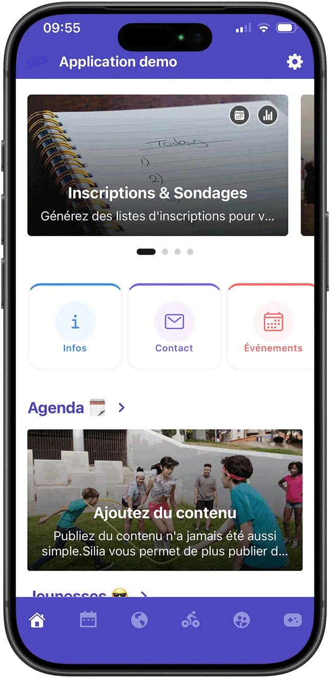 Pas de création de compte compliquée : vos membres téléchargent l'application Silia sur iOS ou Android, entrent le code unique de votre organisation, et c'est tout !